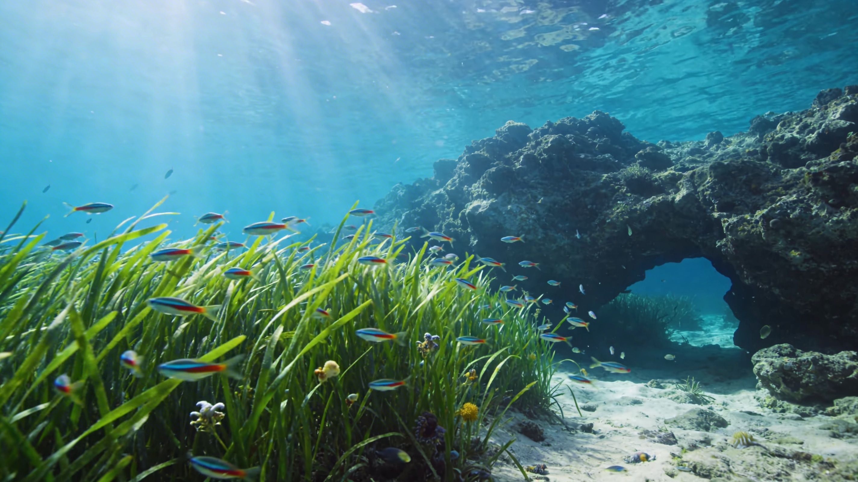 Calabria has rich marine biodiversity because it is surrounded by two different seas, the Tyrrhenian Sea to the west and the Ionian Sea to the east. These waters create a variety of marine habitats, including rocky reefs, sandy seabeds, underwater caves, and seagrass meadows. One of the most important marine plants in the region is Posidonia oceanica, a seagrass that forms underwater meadows along the coast. These meadows are essential ecosystems because they provide shelter and breeding grounds for many marine species, help stabilize the seabed, and improve water quality.